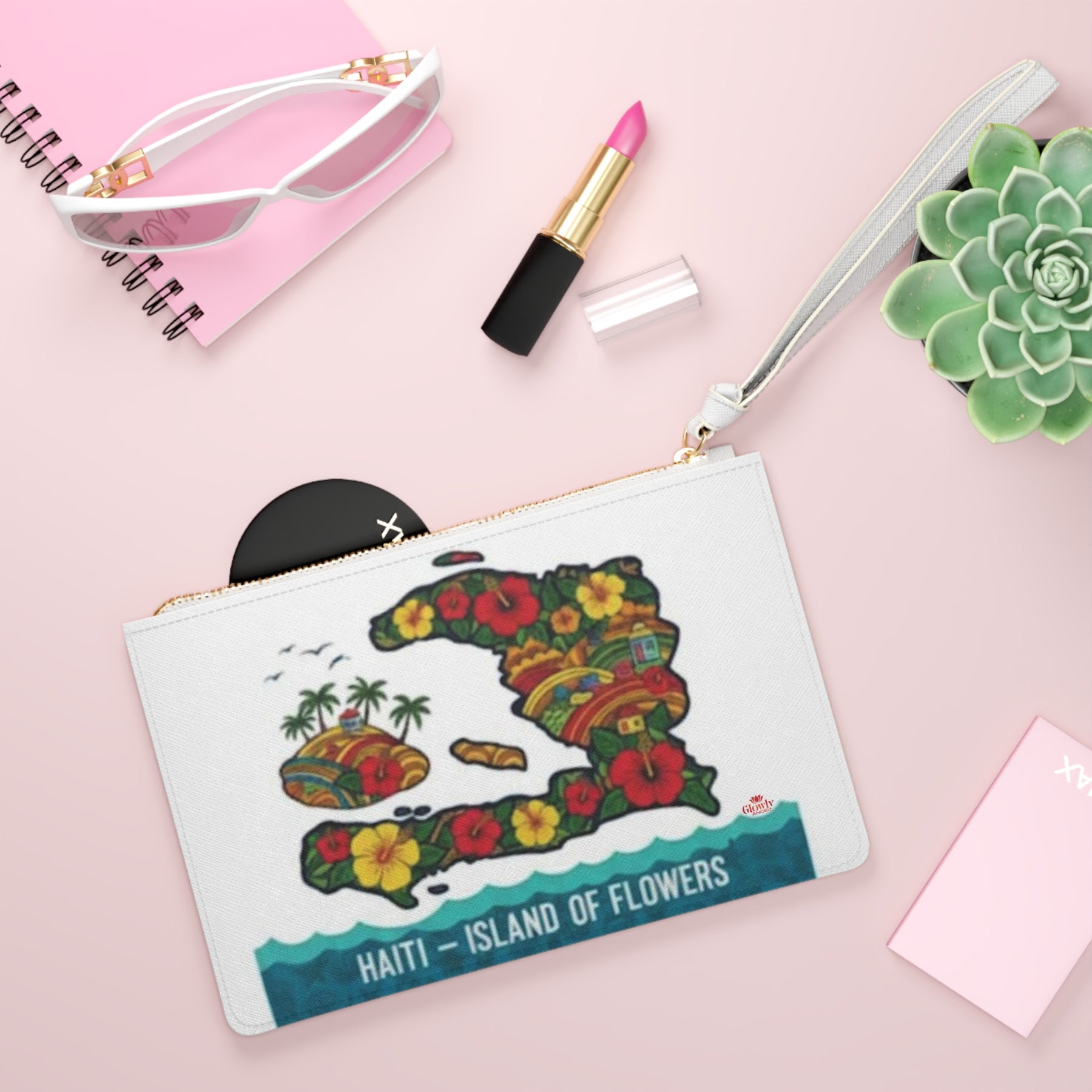 Souple et idéale pour les voyages, cette pochette emporte avec elle un rayon de soleil haïtien. Son motif sur le devant représente l'île sous forme de collage de fleurs, de palmiers et de maisons colorées, surplombant le doux clapotis des vagues et la mention « HAÏTI — ÎLE DES FLEURS ». Elle se glisse facilement dans un sac cabas ou se porte à la main grâce à sa dragonne pour les sorties rapides. À l'intérieur, deux compartiments et une petite poche permettent de ranger reçus, cartes et téléphone sur la doublure noire. Le similicuir texturé saffiano imite le cuir raffiné tout en restant léger et facile à nettoyer. Les finitions dorées ajoutent une touche de brillance subtile et chaleureuse qui s'harmonise avec les couleurs tropicales. Fabriquée avec soin aux États-Unis à partir de composants provenant du monde entier, cette pochette est un accessoire fiable au quotidien, imprégné de l'énergie des îles.
